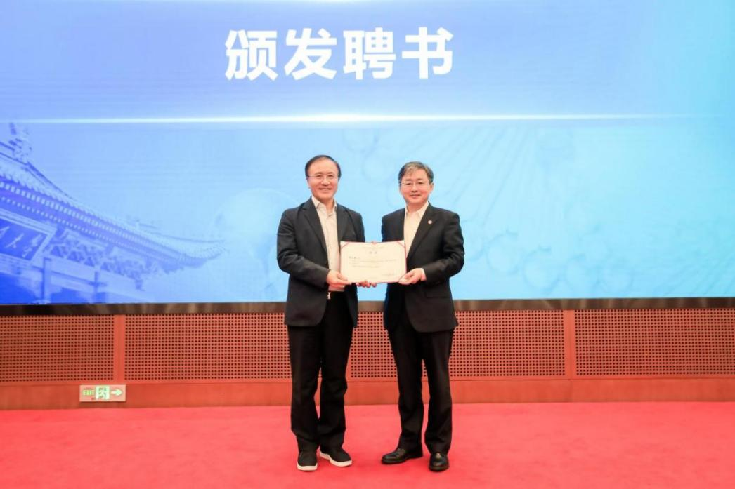 丁奎岭校长、张安胜老师为第一届理事会名誉会长邓子新、会长陈少雄等成员颁发聘书,丁奎岭校长授予生物医药行业校友会会旗。