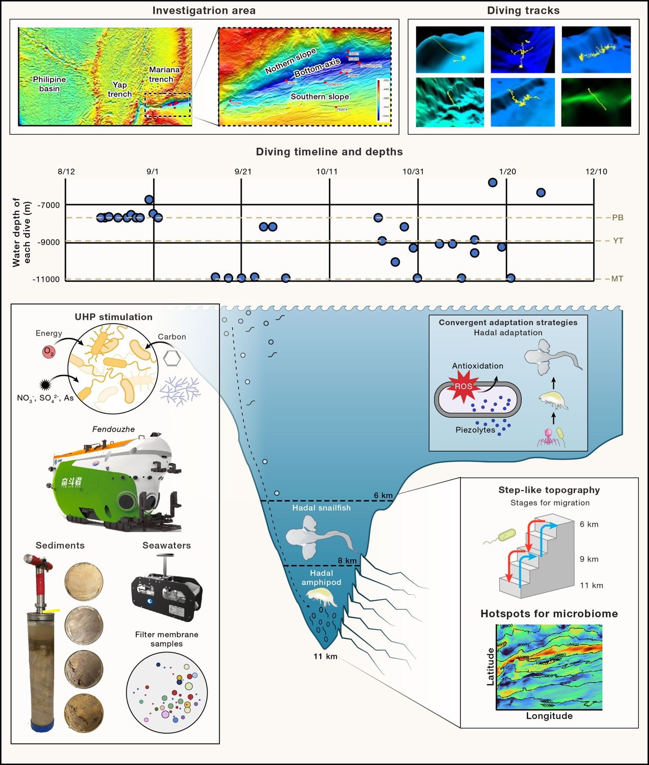 研究团队多次深入深渊海底探索,发现深渊微生物在最深海域超高静水压(600-1100个大气压)下的异常繁盛,揭示了深渊两种代表性宏生物与深渊微生物之间存在趋同的适应机制,即深渊存在跨越物种边界的“共适应”策略,从而串联起了独特的深渊生态系统,描绘了首个海洋最深生态系统的图景。