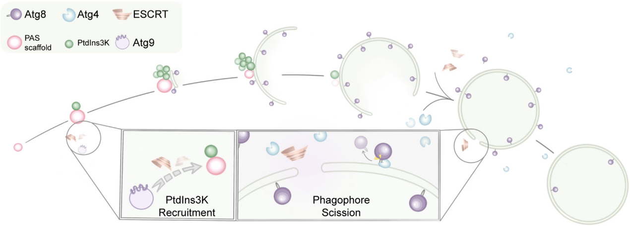 图1. Atg8解离过程和ESCRT调控自噬体形成的示意图