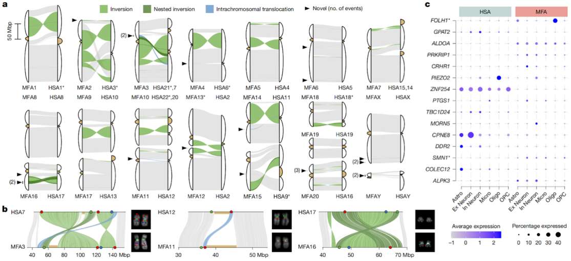 在对比人类与猕猴基因时,研究人员发现了 93 处关键结构差异,其中 21 处为首次发现。比如人类控制大脑谷氨酸代谢的FOLH1基因比猕猴多一个 “备份”,且原始拷贝基因在人类大脑中因 “开关按钮” 丢失而 “沉默”,另一个新产生的备份基因则因基因组 “折叠” 变化改变了细胞表达类型。这种差异可能影响了人类神经系统的独特功能,甚至与智力障碍等疾病相关。这一研究为结构变异在演化过程中如何影响细胞类型特异性表达模式提供了新的见解,特别是在阐明谱系特异性表型的形成及人类疾病的发生机制解析上具有重要的科学意义。