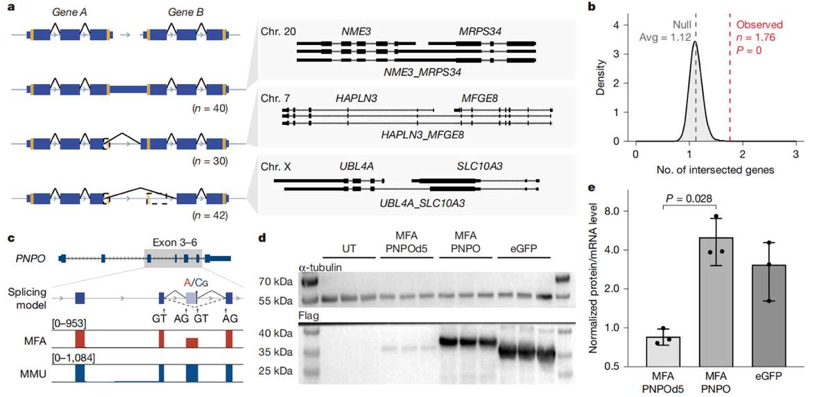 食蟹猴和恒河猴虽同属猕猴家族,但在外貌、行为习惯甚至疾病抵抗力上差异明显。研究团队聚焦 RNA 剪接机制,鉴定出 110 个种间差异的外显子跳过事件。其中 PNPO 基因的 5 号外显子在食蟹猴和恒河猴中表现迥异,食蟹猴存在 “选择性跳过”。原因是其 5 号外显子区域内存在一个特殊的C→A碱基变异,这种变异可能形成了新的典型剪接受体位点,就像在电影胶片上贴了一个“此处可剪”的标记。经实验验证,这种基因剪辑影响蛋白质稳定性或翻译效率,日积月累造成了两物种的生理分化,为动物实验模型选择提供了关键分子依据。