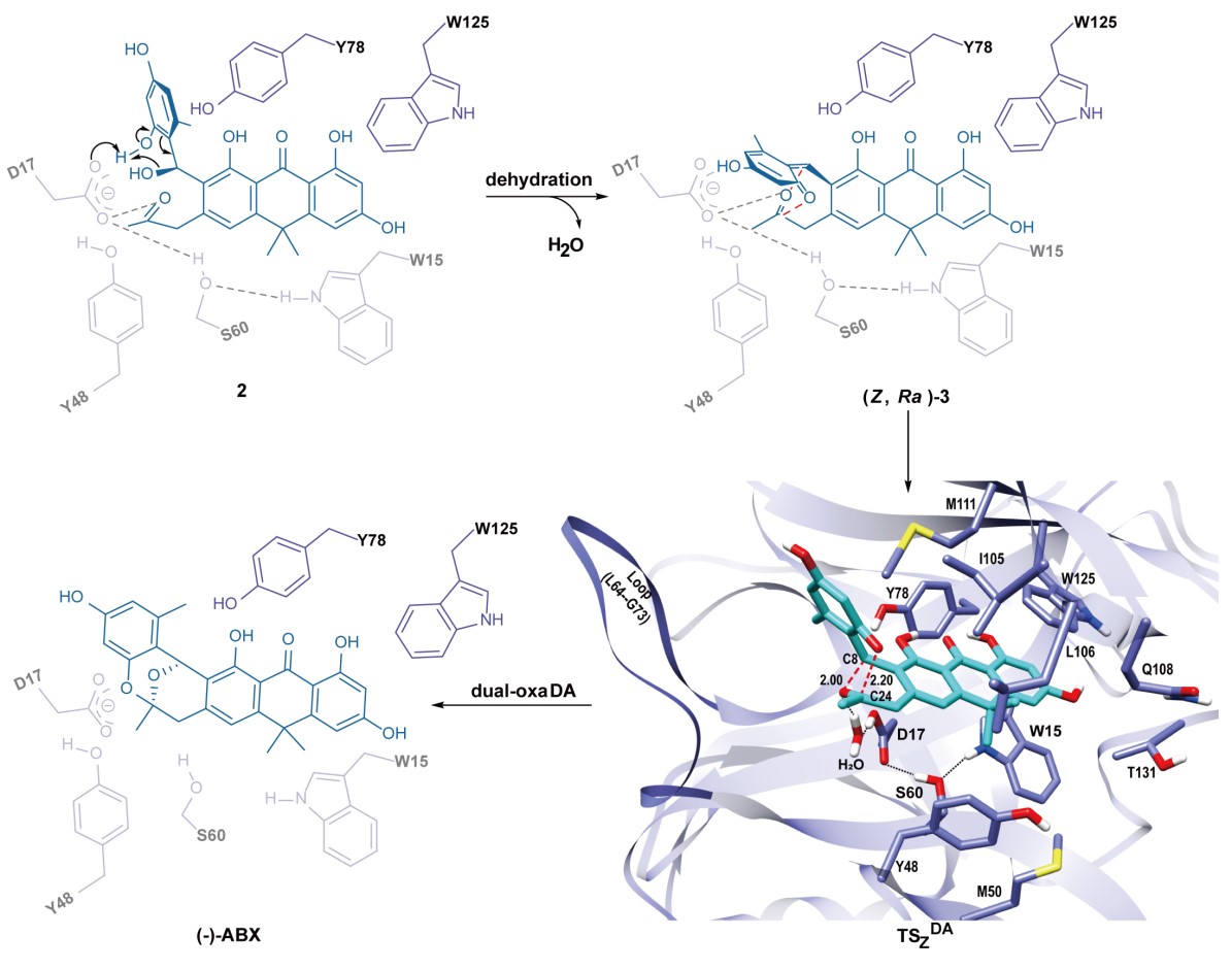 本项目中,联合研究团队通过系统的体内外实验,首次发现VOC超家族蛋白Abx(-)F是一种具有双重催化功能的DA酶:其首先催化了脱水反应,将化合物2转化成具有特定轴手性的邻醌亚甲基(o-QM)中间体(Z, Ra)-3;其次,立体选择性地催化(Z, Ra)-3发生分子内双氧杂DA反应,精确构建手性三环缩酮氧桥结构。研究团队进一步综合运用X射线晶体衍射、核磁共振(成功解析Abx(-)F及其与底物的复合物结构)及计算化学等方法,揭示了"脱水-配位协同HDA"这一全新催化机制(图2),为理解该类复杂结构的生物合成提供了范式转变。