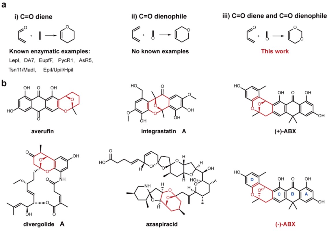 杂Diels-Alder反应(HDA)是构建六元杂环化合物最高效的方法之一,在药物化学、材料科学及天然产物合成中具有广泛应用。其中,氧杂HDA反应(即二烯或亲二烯中含氧原子)是最常见的类型,能够高效构建含氧杂环骨架。然而,尽管自然界已发现多种催化单一氧杂HDA反应的酶(如LepI、EupfF、Tsn11等),双氧杂DA反应(即同时涉及两个氧原子的[4+2]环加成)却从未被报道,其催化机制与酶学基础完全未知。