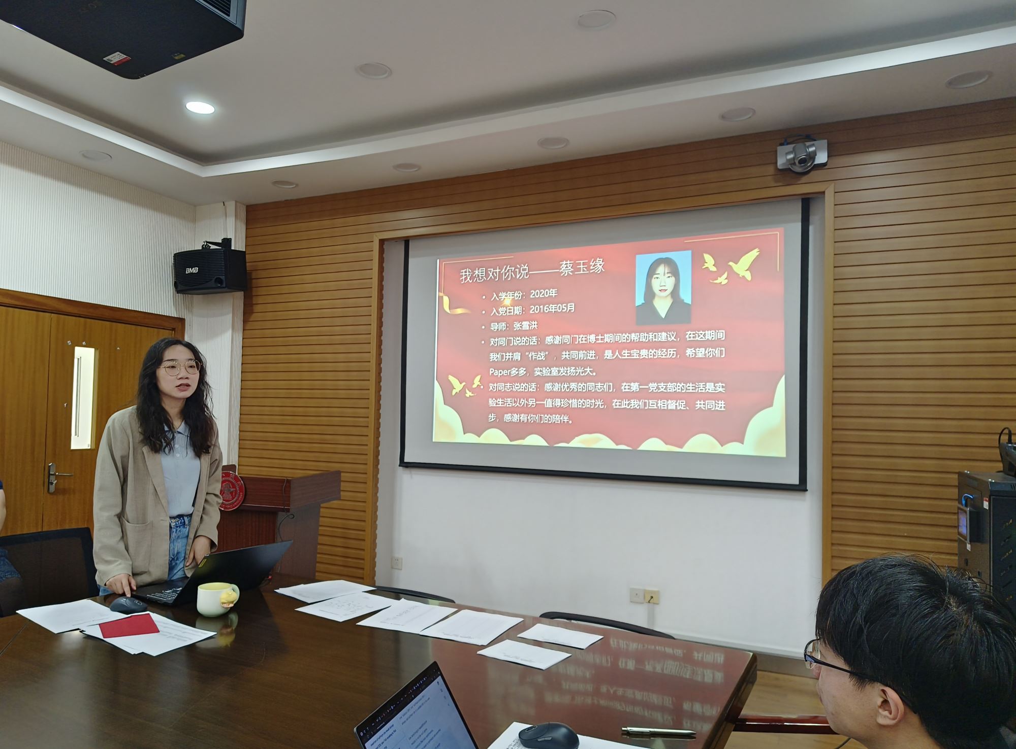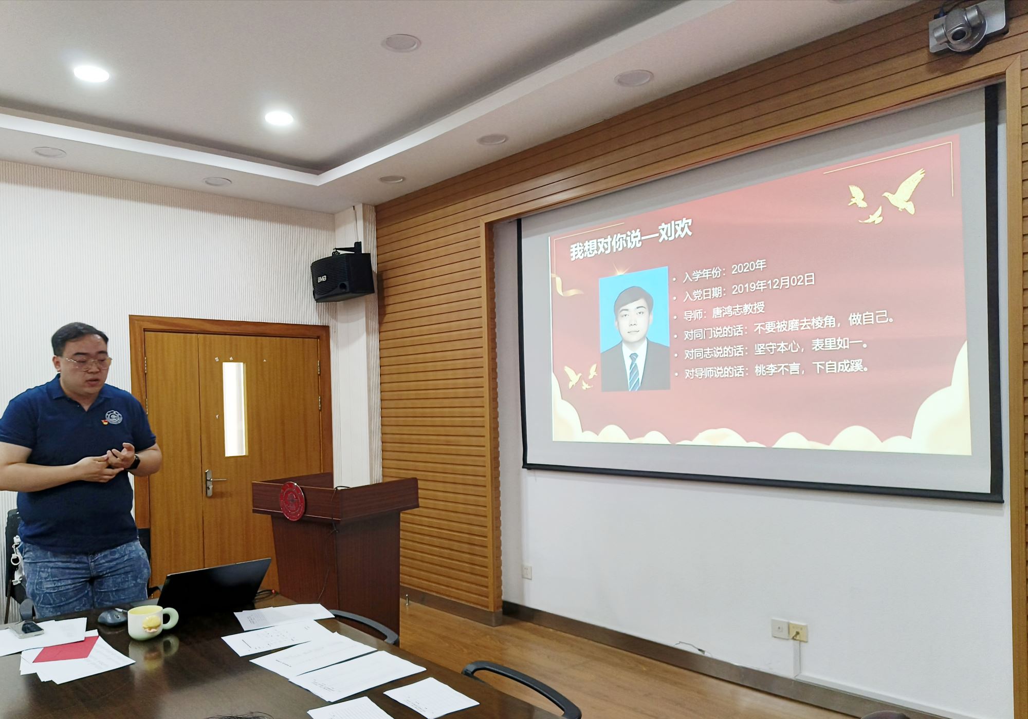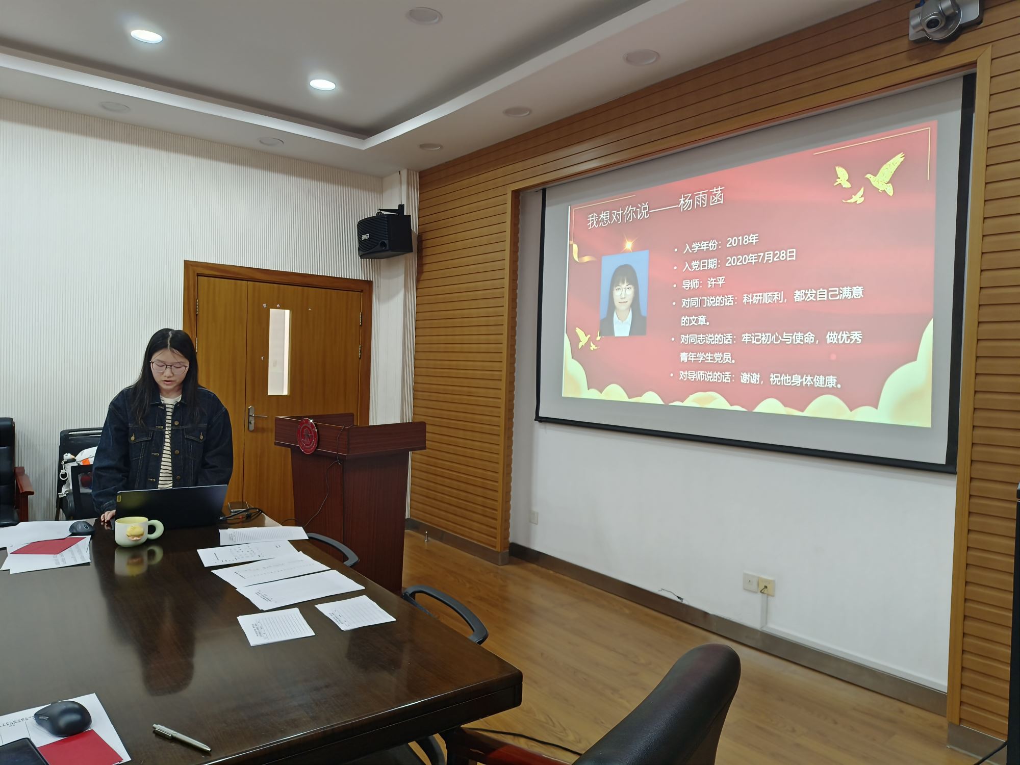 随后,党支部正式开展“我想对你说,共话毕业情”活动。蔡玉缘、杨雨菡、崔浩天和刘欢四位同志依次分享了他们想对身边同学、对党员同志和对导师说的话,并分享了多个实用的科研工具。蔡玉缘同志提到,支部的督促是她进步的动力之一,她鼓励同志们严格要求自己,不断磨练党性修养,用不断进步的姿态吸引更多同学加入党组织;杨雨菡同志说道,党员最重要的是不忘初心和使命,要一以贯之地做优秀青年党员;崔浩天同志表达了对老师们的感激,他认为只有心怀感恩才能不断向前,要以老师们的精神为榜样,为党和国家做贡献;刘欢同志回顾了两年来担任支部书记的心路历程,感谢了支部成员对本届支委班子的支持和监督,鼓励支部成员坚守本心、表里如一,做清清白白的党员,干轰轰烈烈的事业。