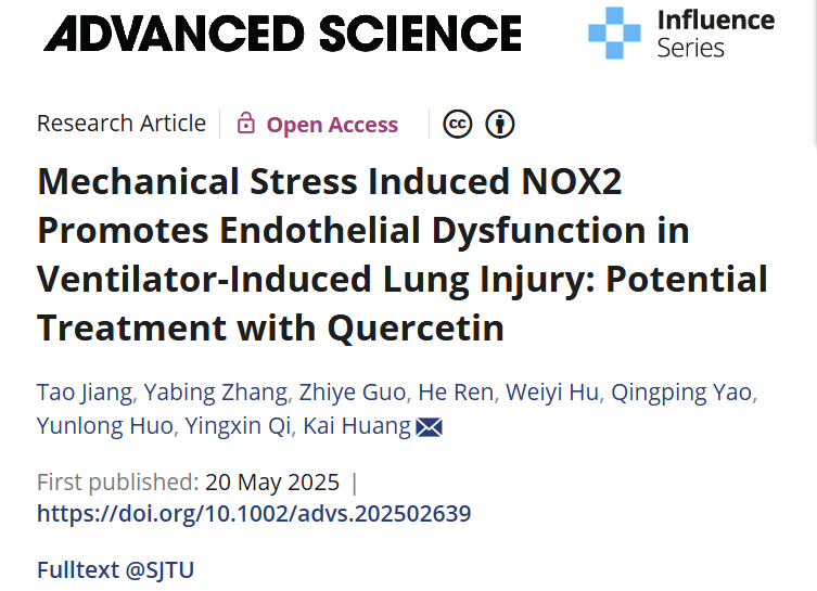 5月20日,Advanced Science上线了该团队长聘教轨助理教授黄凯为通讯作者的研究论文“Mechanical Stress Induced NOX2 Promotes Endothelial Dysfunction in Ventilator-Induced Lung Injury: Potential Treatment with Quercetin”。硕士研究生姜涛以及四川大学张亚兵医生为本文的共同第一作者。该工作阐述了机械应力引发肺损伤的氧化应激来源、力学信号传导机制、缓解氧化应激的特异性策略以及潜在治疗机械应力引发肺损伤的治疗方法。这一研究有望引起各界对临床常常忽视的呼吸机引发的肺损伤的关注,也提供了潜在预防呼吸机引发肺损伤的方法。