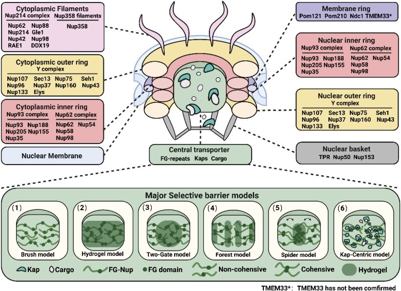 同日,齐颖新特聘教授和黄凯助理教授指导五位本科生(吴昆澎、闫智杰、庄晓熙、华晋亮、李萌潇)在International Journal of Biological Macromolecules杂志发表了题为“Dynamic structure and function of nuclear pore protein complex: Potential roles of lipid and lamins regulated nuclear membrane curvature”的综述论文。核孔复合体(NPC)是一种巨大且高度复杂的蛋白质组装体,作为关键的门户,NPC介导大分子在细胞质和细胞核之间的双向运输。本文概述了该蛋白质复合体的结构和运输功能,并重点介绍了NPC运输功能模块的选择性屏障模型。