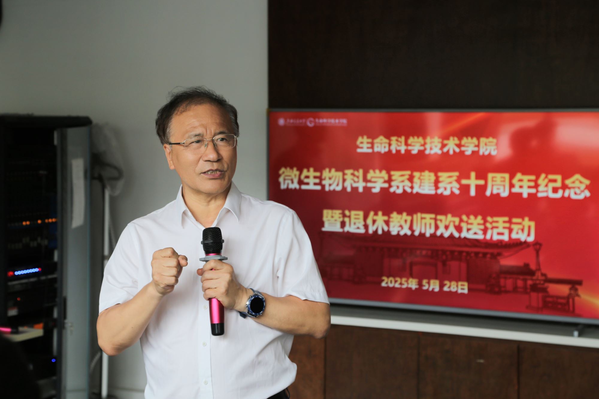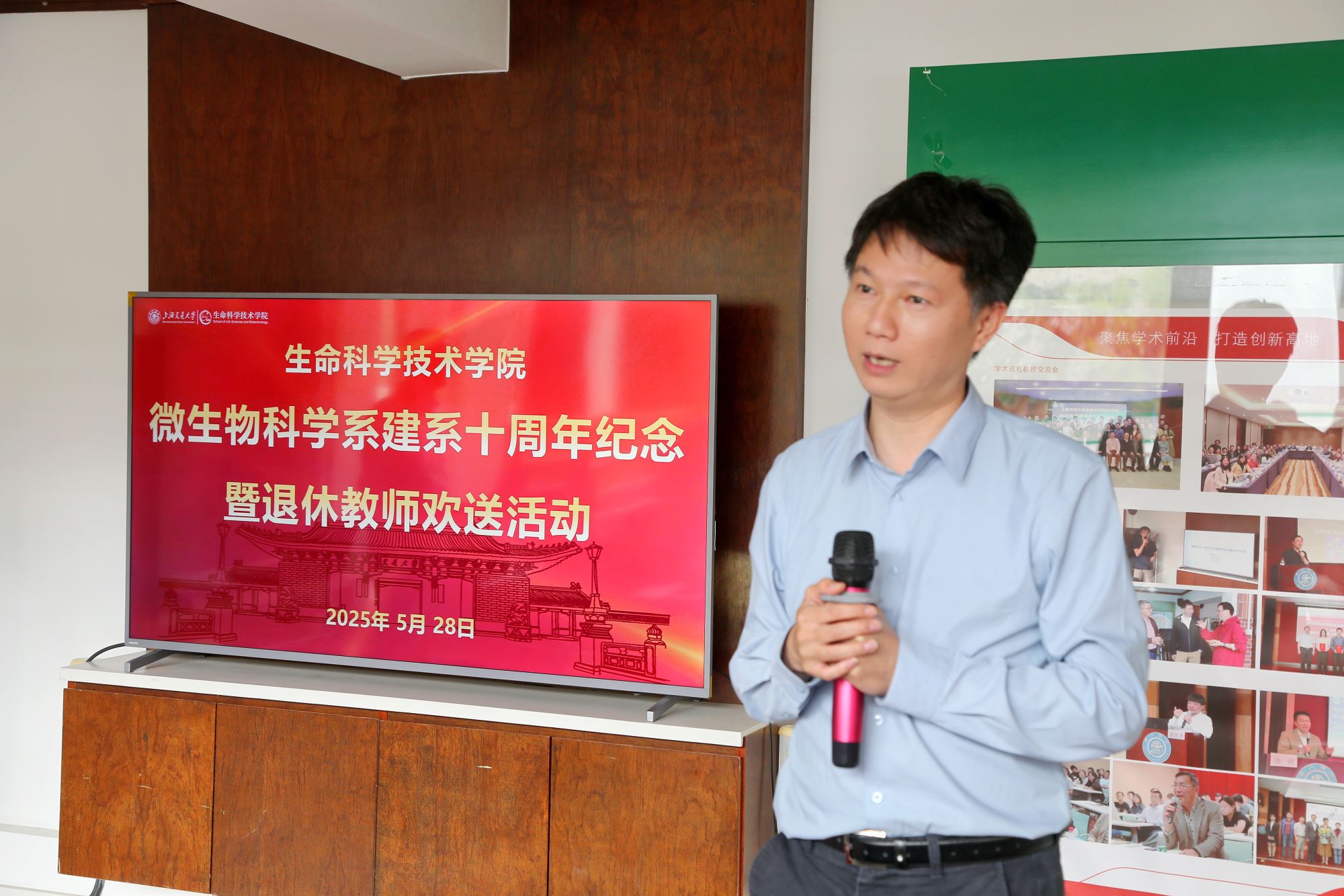 2025年5月28日中午,生命科学技术学院微生物科学系全体教职工、博士后及特邀嘉宾齐聚学院教工之家,共同庆祝建系十周年纪念活动暨退休教师欢送活动。此次活动通过回顾十年历程、展望学科前沿、致敬荣休教师等环节,全面展示了微生物科学系的丰硕成果与未来蓝图。名誉院长邓子新院士、张雁院长、冒巍巍书记出席了活动,会议由微生物科学系党支部书记徐俊主持。