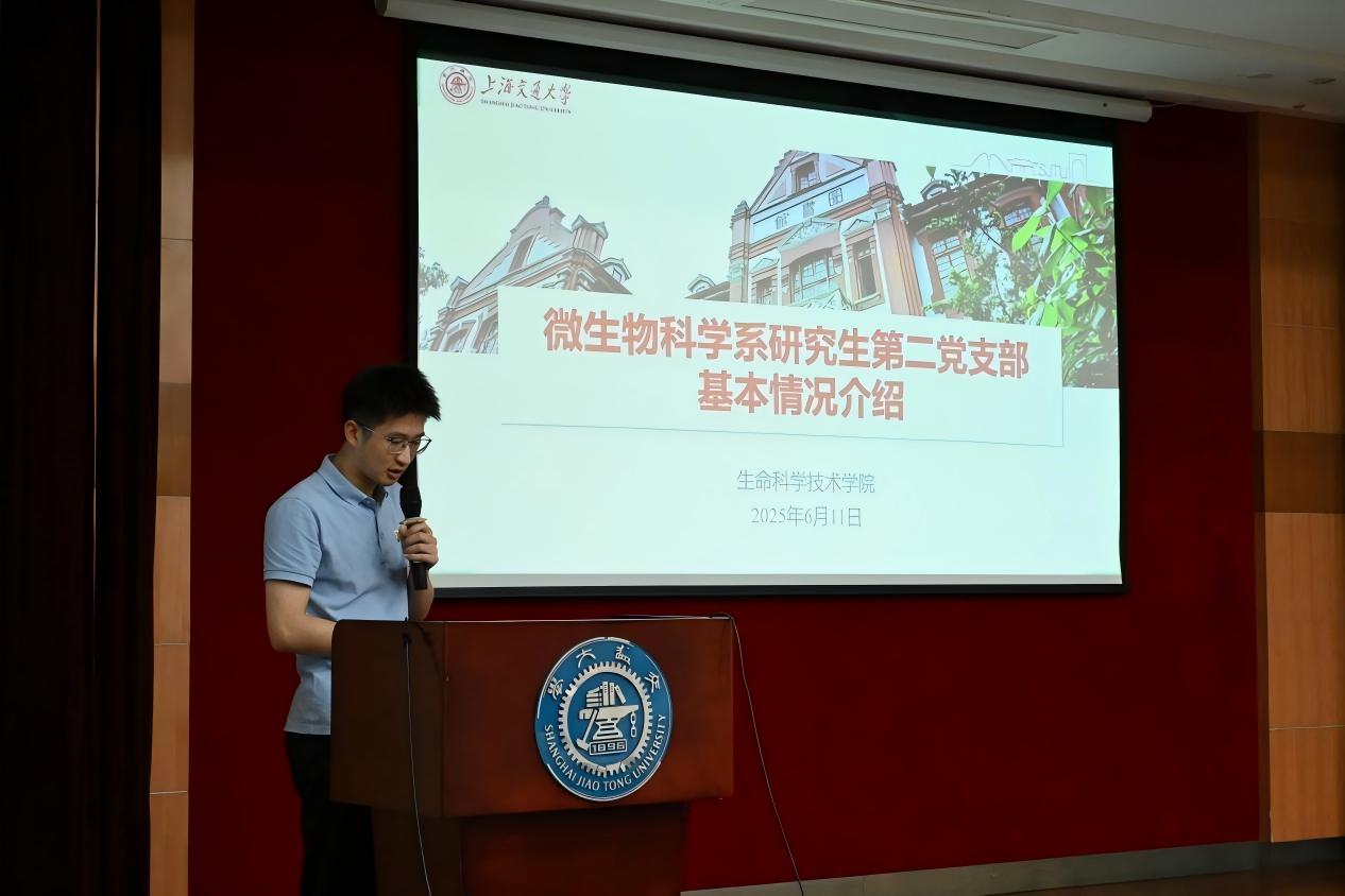 生命科学技术学院微生物科学系研究生第二党支部书记张辉作支部介绍。他详细介绍了支部设立的基础和支部党员的研究方向,并围绕支部建设、思想引领、交流共建、企业参访等活动进行了重点介绍。