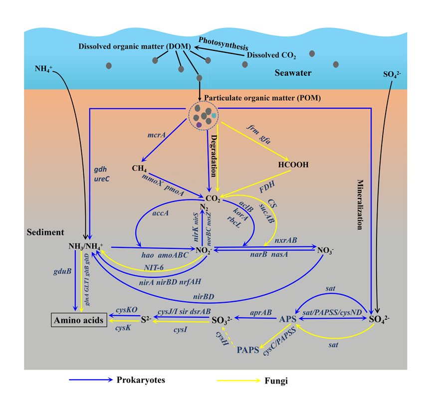 该研究从马里亚纳海沟深渊-超深渊过渡带区域的八个站点采集了三层沉积物样本(表层 0 - 6 厘米、中间层 6 - 12 厘米和深层 12 - 18 厘米),利用宏基因组学策略比较了这些不同站点、不同深度沉积物的真菌群落结构与碳、氮、硫元素循环潜力。结果显示,在马里亚纳海沟深渊-超深渊过渡带三个深度的沉积物中共检测到了 8 个真菌门,其中子囊菌门(Ascomycota)最为丰富,其次是毛霉菌门(Mucoromycota)和担子菌门(Basidiomycota),并检出微孢子虫(Microsporidia)和罗兹菌门(Rozellomycota/Cryptomycota)等稀有类群。马里亚纳海沟深渊-超深渊过渡带区域的南部和北部斜坡之间沉积物真菌群落组成与元素循环潜力没有显著性差异,但是在不同沉积层的精细尺度上的真菌群落组成和碳、硫、氮的生物地球化学潜力呈现出明显差异,这可能是由沉积物不同深度的理化性质差异性决定的(图1)。特别值得注意的是,基于真菌宏基因组数据揭示了同化硫酸盐还原(ASR)途径的关键基因——sat、cysI 和 cysC/PAPSS 催化过程,显示深海真菌在硫还原与含硫氨基酸合成等方面的重要作用。真菌的同化型硫酸盐还原酶(ASR)酶系、硫酸腺苷转移酶/三磷酸腺苷(ATP)硫酸酯酶(sat)、腺苷硫酸激酶(cysC)用于将硫酸盐转化为腺苷一磷酸(APS),亚硫酸盐还原酶(还原型烟酰胺腺嘌呤二核苷酸磷酸)血红素β组分(cysI)将亚硫酸盐转化为硫化物,最后这种硫化物能够被整合到氨基酸中,例如半胱氨酸和同型半胱氨酸(图2)。同时,研究还发现真菌由 NIT-6 介导的异化亚硝酸盐还原产氨途径,从而为原核微生物生长提供氮源。这些都表明深海沉积物真菌具有不同于原核生物的独特代谢路径。此外,研究还提示深海真菌与原核微生物群体之间具有功能上的互补性,组成元素循环网络,协同驱动深海元素循环(图3)。