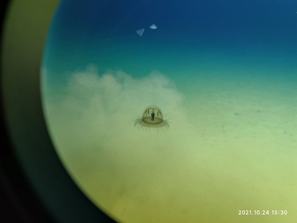 “奋斗者号”一点点往下探,赵维殳很快被迷住了。黑暗中,荧光生物常“chua”一下,流星般闪过窗口,黄的、绿的、蓝的、红的。坐底的那一刻,潜水器头部的探照灯打开,海水呈现出一种此生未见的幽蓝色,循着光映射的地方,她的眼睛好像不断在快速变焦。刚开始只有蓝;再聚焦,游动的透明小水母、小虾开始被瞳孔捕捉到;往下看,荒漠一般的海床,其实趴着透明的海参、海星、海葵……原以为是高压下“生命禁区”的深渊,呈现出异常繁荣盛大的“生命狂欢”。当时当刻,便成永恒。