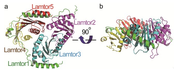 The mTOR signaling pathway us a very conserved signal transduction pathway present in unicellular organisms (such as yeasts), plants (such as Arabidopsis), invertebrates (such as fruit flies), and vertebrates (such as human). It regulates many important life processes such as cell growth and differentiation. Mutations of critical genes in the mTOR signaling pathway are closely associated with human diseases such as cancer and diabetes. The pentameric protein complex Ragulator is a key complex in the mTOR signaling pathway. It is located to the lysosomal surface through its Lamtor1 subunit. The Ragulator complex recruits the mTORC1 complex to the lysosomal surface, through the mediation of the RagA-RagC GTPases complex, to be activated by another small GTPase Rheb.
