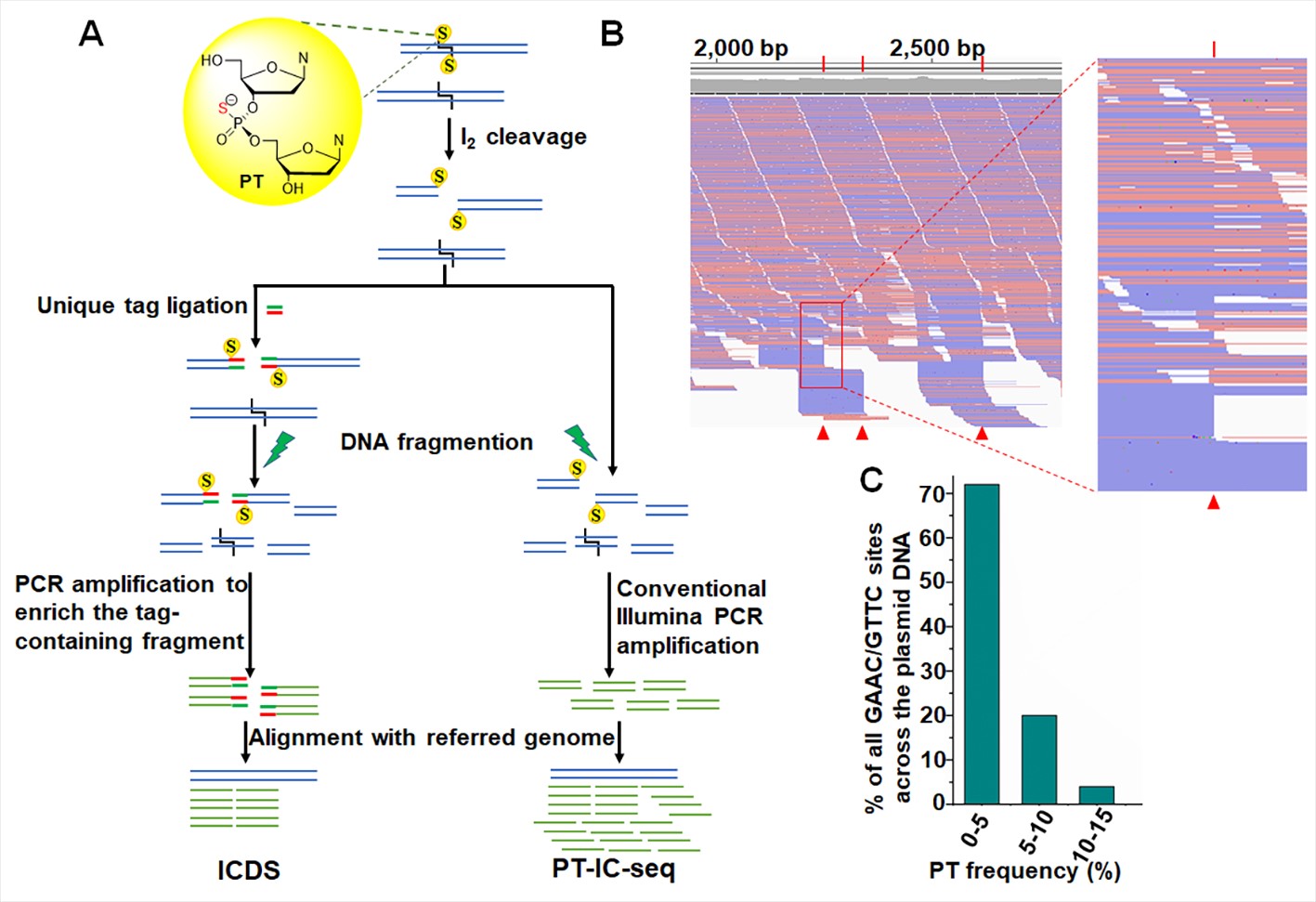 Phosphorothioate (PT) modification is a novel DNA modification, previous studies showed that PT modifications in E. coli occure at GpsAAC/GpsTTC motifs, but the modification frequency at each site are not known. In this study, the authors developed the PT-IC-seq technique, based on iodine-induced selective cleavage at PT sites and high-throughput next generation sequencing, as a mean to quantitatively characterizing the genomic landscape of PT modifications. Using PT-IC-seq they found that most PT sites are partially modified at a lower PT frequency (< 5%) in E. coli B7A and Salmonella enterica serovar Cerro 87, and both show a heterogeneity pattern of PT modification similar to those of the typical methylation modification. Combining the iodine-induced cleavage and absolute quantification by droplet digital PCR, the authors developed the PT-IC-ddPCR technique to further measure the PT modification level. Consistent with the PT-IC-seq measurements, PT-IC-ddPCR analysis confirmed the lower PT frequency in E. coli B7A. These results have demonstrated the heterogeneity of PT modification in the bacterial population, and will open the door to understanding biology of this novel DNA modification.