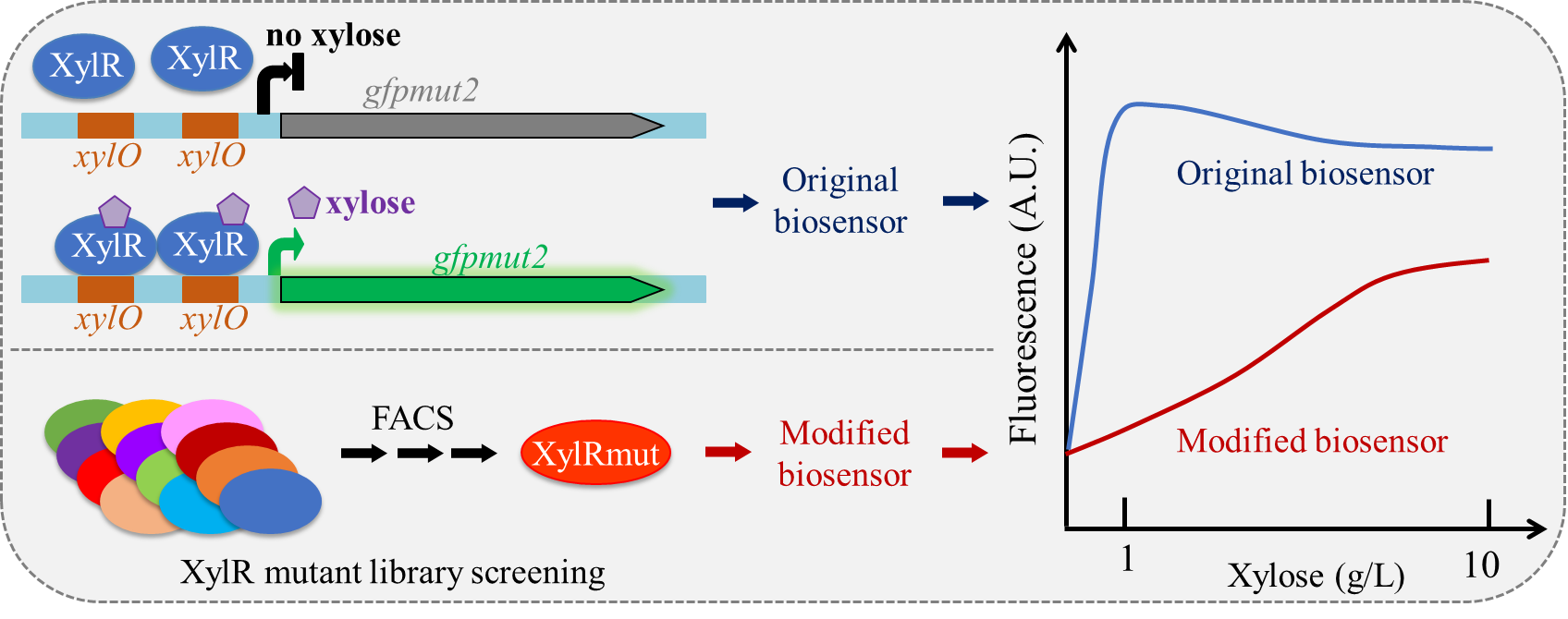 Biosensors are useful tools that are widely used in synthetic biology, which commonly consist of three parts: 1) the sensing part; 2) the transduction part, and 3) the output part. Xylose biosensors reported in the previous studies exhibited limited operating range of xylose concentration compared to the xylose concentration in lignocellulosic hydrolysates, which limited their application in screening of recombinant microorganisms. Thus, it is of great importance to develop a xylose biosensor with an expanded operating range.