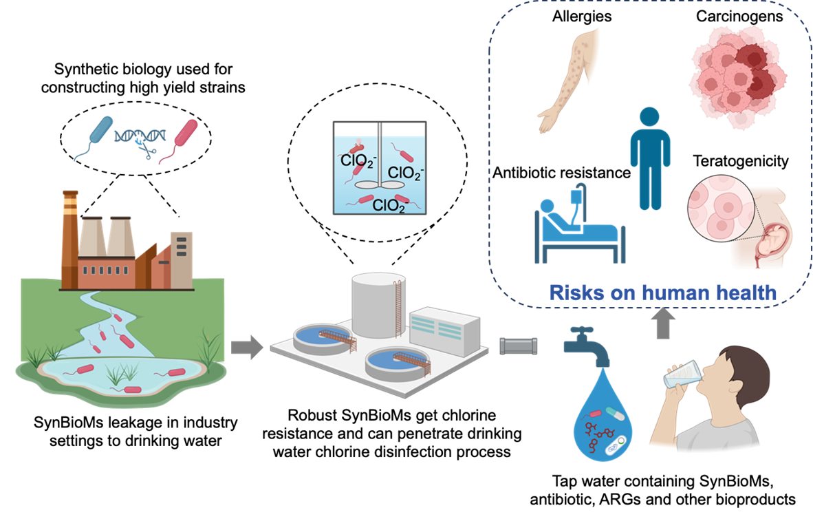 In order to increase the yields and titers, synthetic biology have been widely applied to increase microbial tolerance to bioproducts, However, synthetic biology microorganisms (SynBioMs) can enter natural water environment through wastewater discharge. The molecular modification methods to enhance microbial tolerance to bioproducts are likely to enhance microbial resistance to disinfectants and help microorganisms pass through the water treatment processes, which will seriously threaten the biosafety of drinking water.