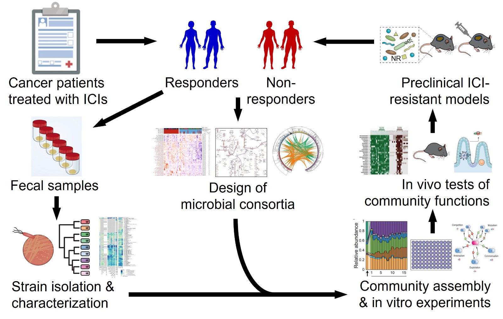 Cancer immunotherapy with immune checkpoint inhibitors (ICIs) has become highly successful against an array of distinct malignancies including advanced melanoma, non-small cell lung cancer (NSCLC), and renal cell carcinoma. Despite the remarkable success of the ICIs targeting programmed cell death protein 1 (PD-1) and its ligand PD-L1, the majority of patients have yet to receive durable benefits. Growing evidence suggests that the gut microbiota modulates the efficacy of cancer therapy. By using a bottom-up synthetic ecological approach, we design and assemble a microbial consortium,  which is comprised of gut bacterial species derived from patients with NSCLC responsive to PD-1 blockade therapy. The synthetic bacterial community is targeted to enhance anti-tumor immunity and circumvent resistance to ICIs. In addition, we also engineer bacteria to develop novel therapies for cancer and other diseases.