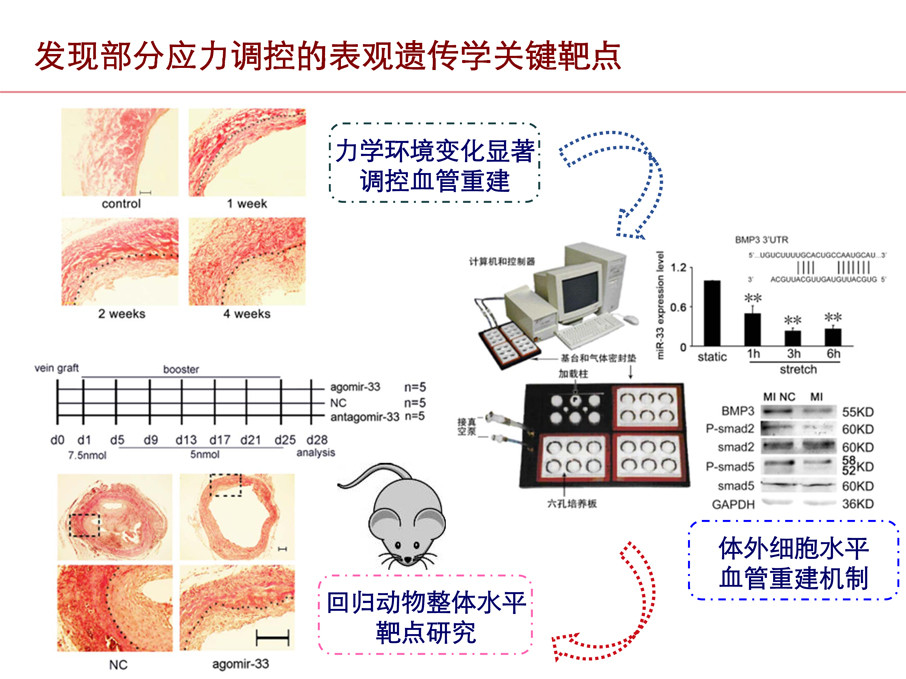 以表观遗传学调控相关的组蛋白去乙酰化酶 SIRT、微小RNAs(miRNAs)和长链非编码RNAs(LncRNAs)为切入点,研究应力调控血管稳态和诱导血管重建的力学生物学机制。该研究对于揭示心血管疾病血管重建临床治疗新的药物靶标具有重要的科学意义和临床转化前景。