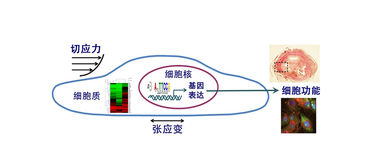 细胞如何将胞外的机械刺激信号转化为胞内的生物化学信号是细胞力信号转导(mechano-transduction)的关键科学问题。国内外现有的相关研究多数集中在 ECs 和 VSMCs 细胞膜表面应力感受器,如膜蛋白和离子通道等。本人关注了细胞核这一细胞内硬度最高和基因转录发生的亚细胞结构,探讨了细胞核骨架蛋白的力学响应机制,将对机械应力感受器的关注由细胞表面转到细胞核,为应力调控血管重建的分子机制研究开辟了一个新方向。