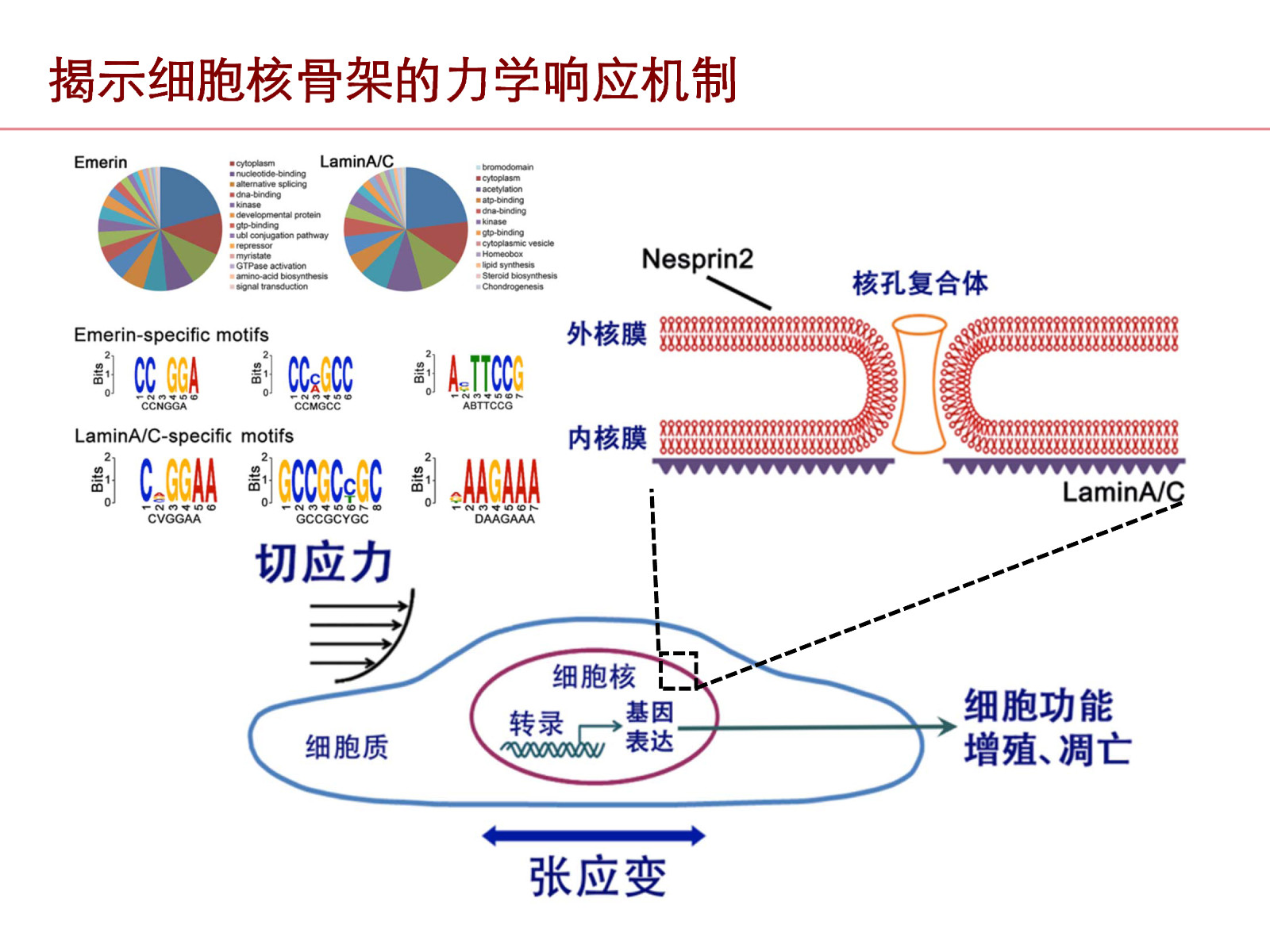 我们的研究以“动物整体水平观察现象-细胞分子水平探讨机制-动物整体水平验证发现”的研究思路,探讨了核骨架蛋白 emerin、laminA/C和nesprin在张应变和切应力诱导血管细胞增殖和凋亡中的作用及其机制。结果表明,细胞核骨架蛋白响应机械力刺激在高血压和动脉粥样硬化血管重建中发挥了重要作用。