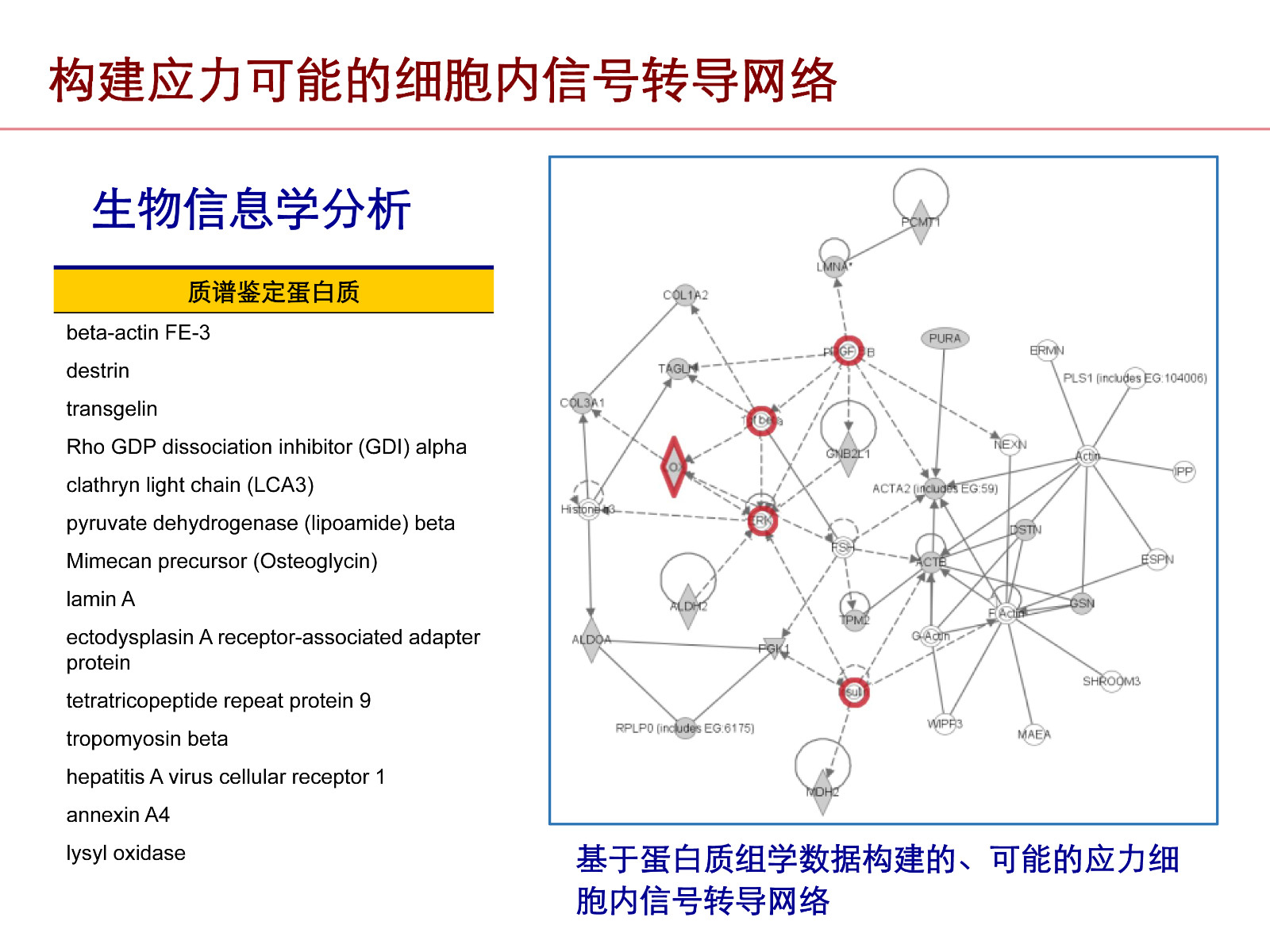 细胞“应力-生长”行为的调控是通过细胞内多种蛋白质参与的、十分复杂的网络来实现的。蛋白质组学研究在特定时间或环境条件下某个细胞或某个组织的基因组表达的全部蛋白质及其相互作用。本人开展“力-血管蛋白质组学”研究,全面、综合地评价细胞内部复杂的力学响应和调控机制;并在此基础上引入了网络的概念,构建了机械应力的可能信号转导网络。该部分研究将生物力学、蛋白质组学、生物信息学与分子生物学相关研究理念和研究技术相结合,体现了学科交叉融合的创新特色和科学价值。