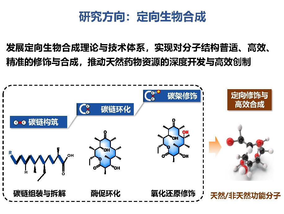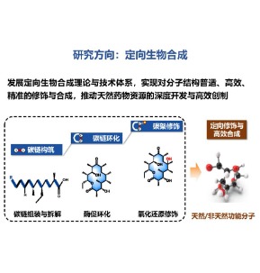 我们致力于融合生物合成与化学合成策略,构建针对重要天然产物的定向生物合成理论与技术体系,实现对碳骨架的普适、高效、精准的合成与编辑,以拓展结构多样性、提升药物生产效率,推动天然药物资源的深度开发与高效创制。